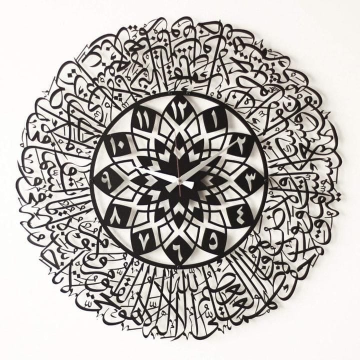 Elevate your space with this exquisite Islamic wall clock, featuring intricate Arabic calligraphy that seamlessly blends spiritual artistry with functional timekeeping. Crafted with meticulous attention to detail, the elegant design showcases traditional Islamic aesthetics while maintaining modern practicality. Perfect for homes, offices, or prayer spaces, this timepiece serves as both a meaningful decorative statement and a daily reminder of cultural heritage. The clear, easy-to-read dial ensures accurate timekeeping, while the sophisticated calligraphic elements add a touch of refined elegance to any interior. An ideal choice for those seeking to honor Islamic tradition through thoughtful home decor.