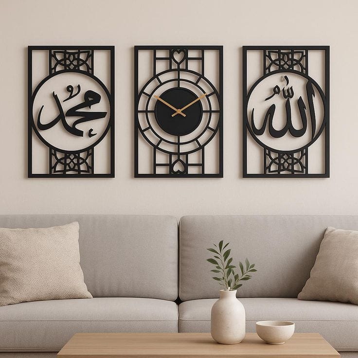 Transform your space with this meaningful Islamic wall art featuring the names of Allah and Muhammad in elegant calligraphy. Crafted with attention to detail, this piece combines traditional Islamic artistry with contemporary design sensibilities, making it a sophisticated addition to any home or prayer space. The intricate lettering showcases the beauty of Arabic script while serving as a daily reminder of faith and spirituality. Perfect for living rooms, bedrooms, or dedicated prayer areas, this wall art brings cultural richness and devotional significance to your décor. A timeless investment in both aesthetics and spiritual reflection.