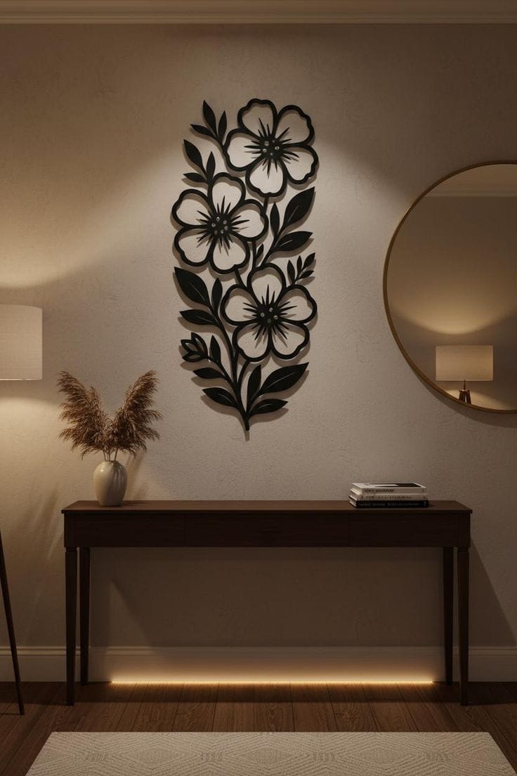 Black Flower Metal Wall Art Decor Transform your space with this striking metal wall art piece, featuring an elegant black flower design that brings contemporary sophistication to any room. Crafted from durable metal with a refined finish, this decor element combines artistic expression with lasting quality. The intricate floral pattern creates visual interest while maintaining a minimalist aesthetic that complements modern, traditional, or eclectic interiors. Perfect for living rooms, bedrooms, or entryways, this wall-mounted sculpture serves as a focal point that elevates your décor without overwhelming the space. Easy to install and built to withstand time, it's an investment in timeless home